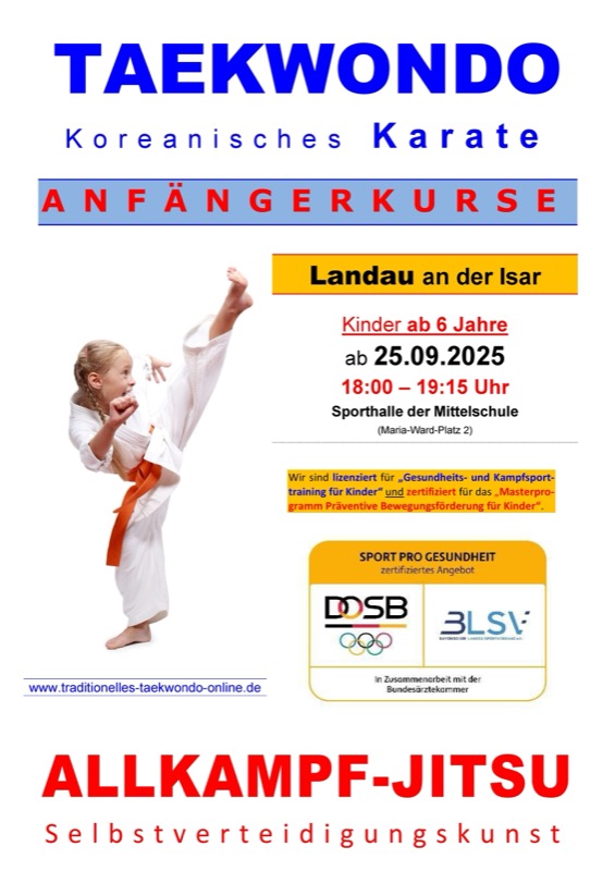 Die Taekwondo-Abteilung des TV Landau bietet zum Saisonstart wieder ein Taekwondo- und Anfängertraining für Kinder ab sechs Jahren sowie für Jugendliche und Erwachsene an. Das Kampfsporttraining eignet sich insbesondere auch für die Generation 40+. Schlagtechniken werden ohne Körperkontakt abgestoppt und Hebeltechniken nicht über den Schmerzpunkt hinaus ausgeführt, einseitige Bewegungen werden vermieden und durch konsequentes Training des Stütz- und Bewegungsapparates kann vor allem den modernen Volkskrankheiten wie Rückenleiden, Haltungsschäden oder Herz-Kreislaufproblemen vorgebeugt werden.